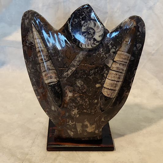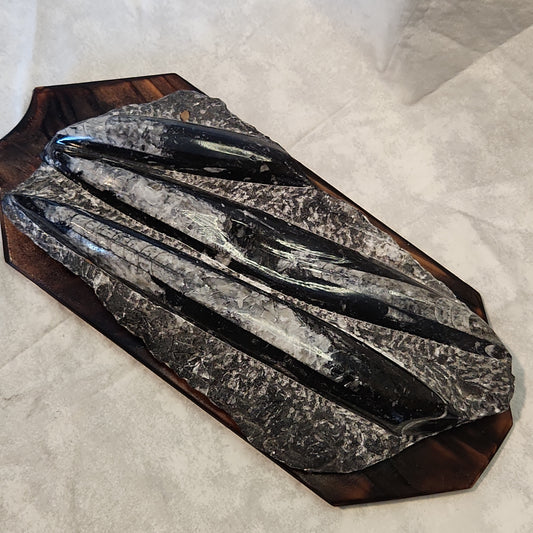 Fossils, Orthocera Polished Stone Display Plate on a Reclaimed Ceder Burned Wood Base