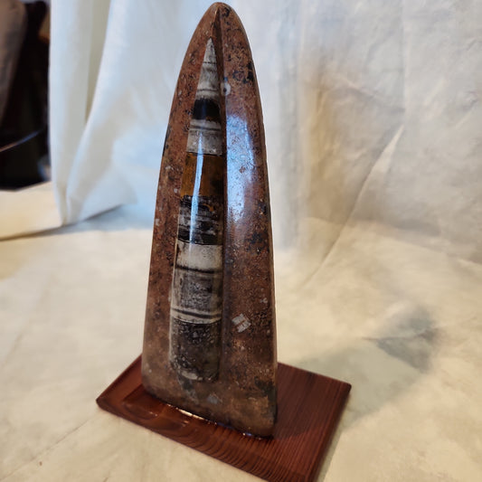 Fossils, Medium-Large Orthoceras Polished/Rough Natural Stone Sculpture Display with Burned Reclaimed Cedar Wood Base