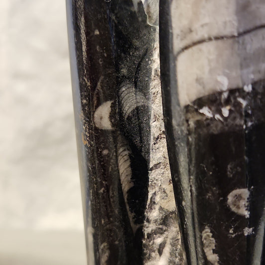 Fossils, Orthocera Polished/Rough Natural Stone Sculpture Display with Burned Reclaimed Cedar Wood Base
