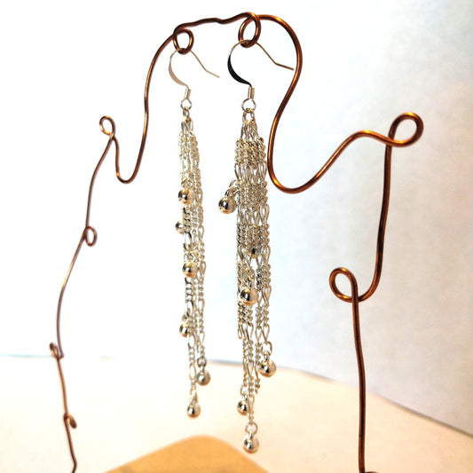 Beaded Silver Balls Cascading Waterfall Long Chandelier Earrings